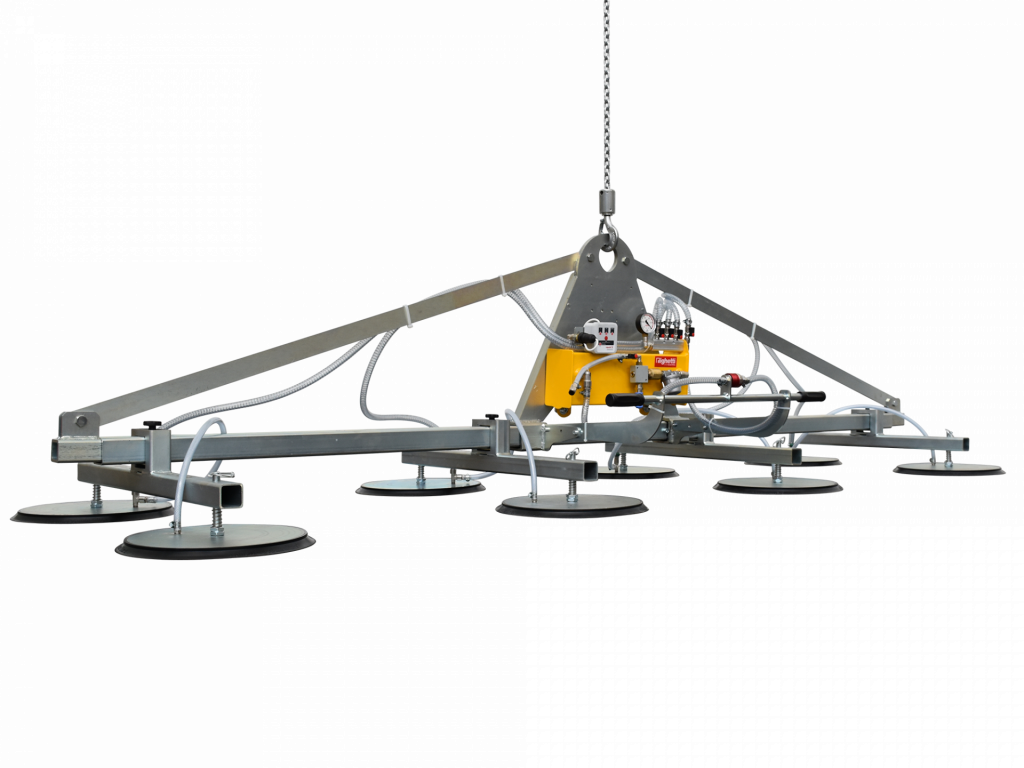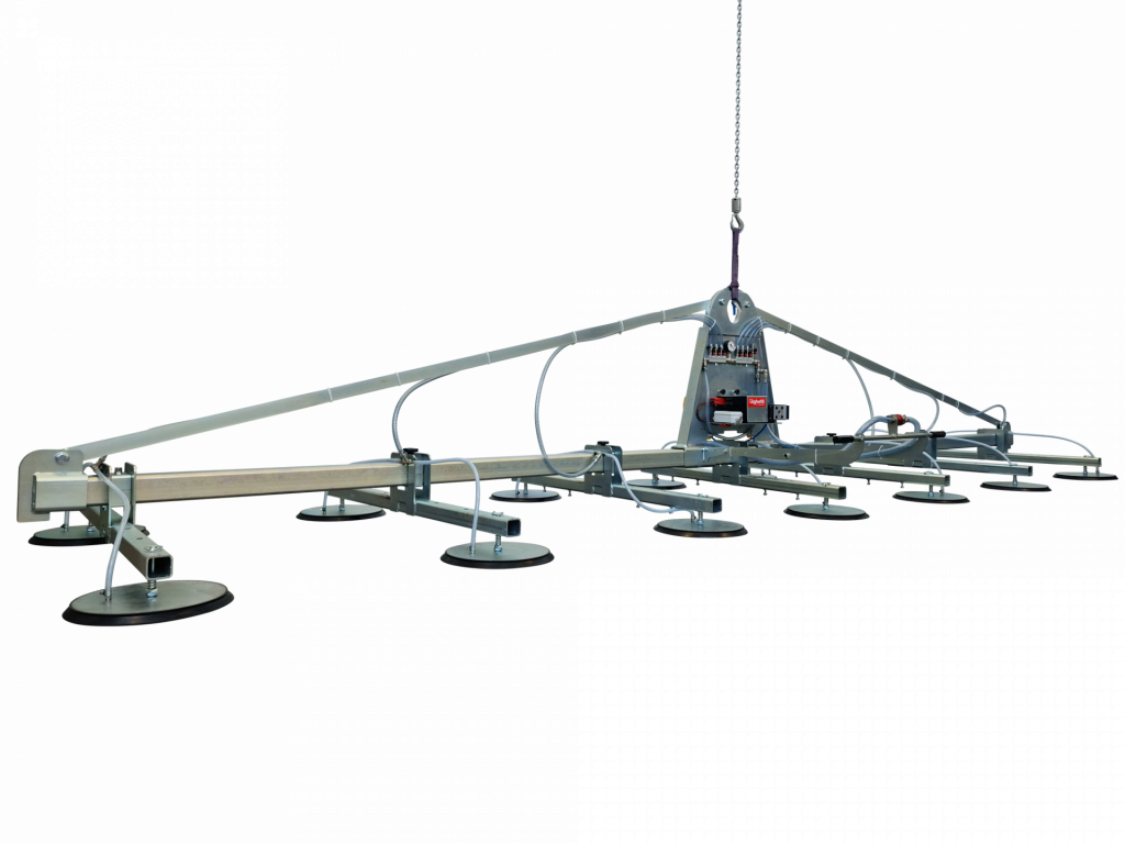 Los elevadores de ventosas para chapa de la serie FS6 están equipados con 6 placas de ventosa redondas, colocadas por parejas en tres brazos reposicionables.
