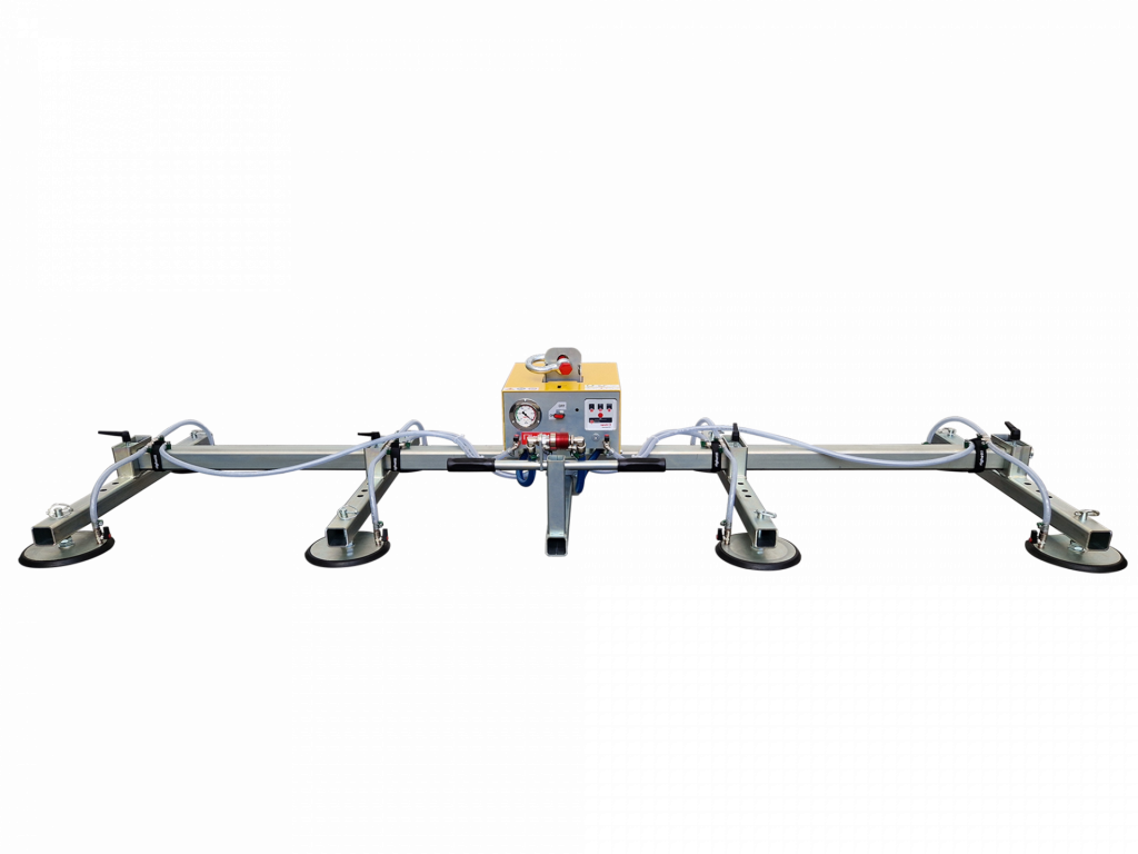 La serie está equipada con cuatro placas de succión redondas, de 200 mm de diámetro, que pueden reposicionarse fácilmente a lo largo de los dos brazos. Con un travesaño horizontal fijo de 1950 mm, la FS4 garantiza el agarre de chapas metálicas y pequeños materiales no ferrosos.