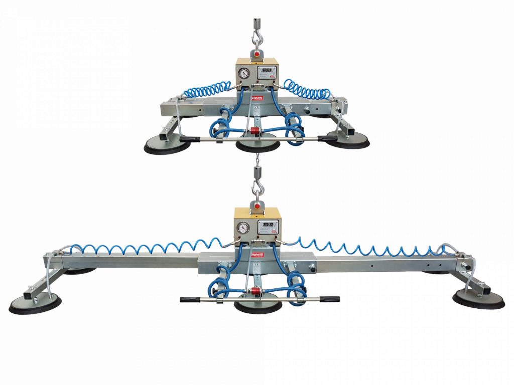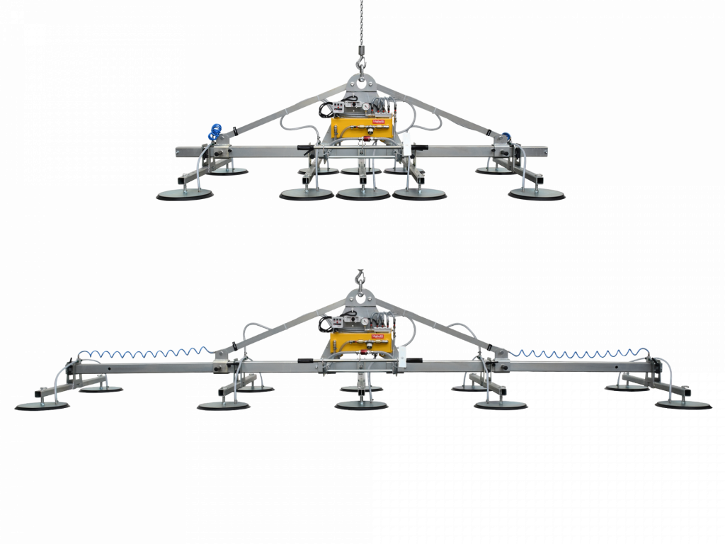 El bastidor extensible permite ajustar fácilmente las dimensiones del elevador de ventosas a las dimensiones de la carga a manipular, minimizando las dimensiones totales.